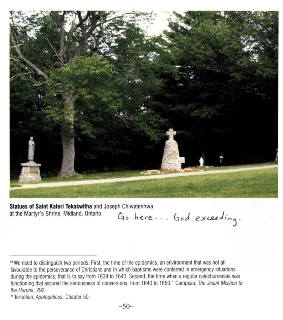 More recently, I took another look at this book about this Huron saint and found this photo accompanied by my prayerful marginalia about hoping to visit the Martyrs’ Shrine in Midland, Ontario one day.