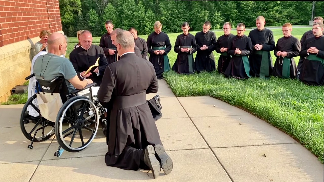 Today a friend and colleague of mine shared this incredibly moving video in which a priest who has received a terminal diagnosis bids farewell to the priests, seminarians, and women religious surrounding him with prayer and affection.